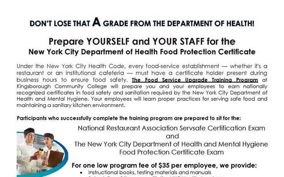 The purpose of the food handlers essentials training program is to prepare food handlers to enter the workforce by providing the required food safety information as specified by regulations of the workers state or local government. The nyc health academy trains individuals in food protection practices to ensure the safety of the food served in new york citys food establishments. The classroom course is offered. The nyc health code requires that supervisors of food service establishments and non retail food service establishments be certified in food protection.